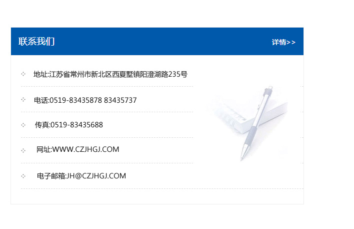 傳真:0519-83435688    郵編:213135    網址:WWW.czjhgj_com.asdyx.com    電子郵箱:JH@czjhgj_com.asdyx.com